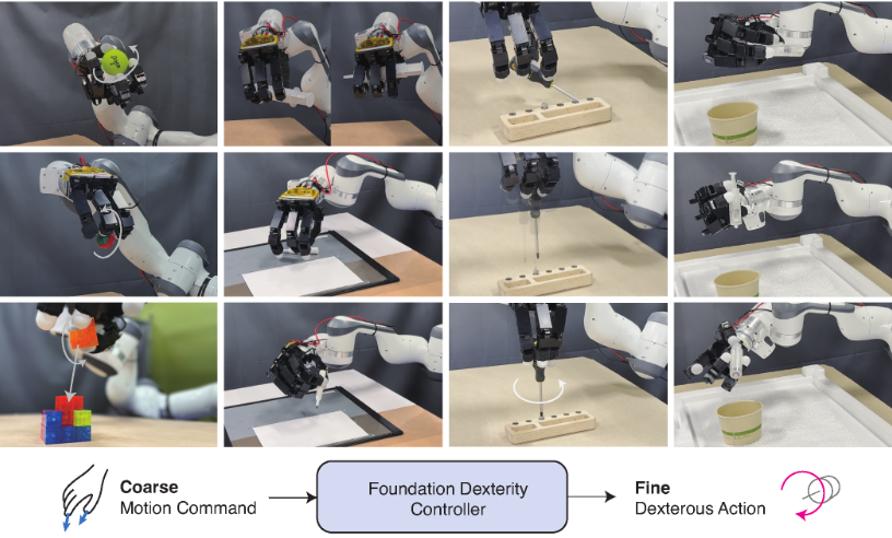 如上论文 Fig.1 左侧显示“Coarse Motion Command → Foundation Dexterity Controller → Fine Dexterous Action”的链路,左侧是人类通过远程操控给出粗动作;中间是 DexGen 的“生成控制器”,把粗动作翻译成多接触、安全的细动作;右侧是各种高难技能(在手内大幅重定向+工具使用)的实拍帧。要点:①“提示→细动作”的箭头表明这是“以人提示驱动”的运动合成;②控制器内部标出“RL 预训练基元库”,解释了“泛化来自大量运动原子”的直觉;③右侧多案例并列,强调“同一控制器跨任务/跨物体的复用性”。