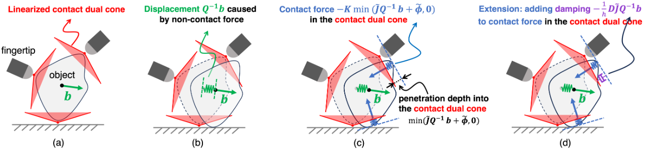 如上原文Fig. 2 ,用一个不含互补约束(complementarity-free)的闭式多接触模型来近似传统接触动力学。具体地(详细公式请参考原文), (a) 红色阴影:线性化的“接触对偶锥”约束区域。 这是原始 QP 接触模型中的对偶锥约束的几何示意;物体与地面/指尖的接触可行域被红区刻画。 (b) 绿色箭头:仅由“非接触力”b 引起的位移。 (c) 蓝色箭头:由“穿入对偶锥”触发的“弹簧样”接触力。 直观上就是“若位移使得状态穿入(penetrate)红色对偶锥,就像把‘弹簧’压缩了,于是产生朝外的接触力”。 (d) 紫色箭头:把阻尼并入接触力(扩展版)。 在弹簧样项之外,再加一项与接触点相对速度相关的阻尼,形成更稳定的时步更新;这在图 (d) 以紫色标示。