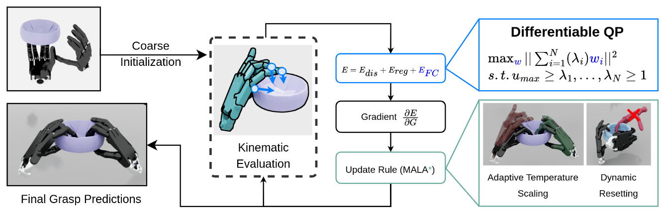 内容简介: 问题是:灵巧抓取不该只有“抓住没”,而是要按抓取类型来抓(比如 31 类 GRASP taxonomy)。作者提出一个从“人标注的手型模板”出发、两阶段自动合成大规模“类型化”灵巧抓取的流水线:先“让物体适配手模板”,再在物理仿真里“让手微调适配物体”。该策略能生成接触丰富、无穿模、物理可信的抓取,并通过接触力控制校验。最后他们做出 10.7k 物体、950 万抓取、31 种抓取类型的大数据集,并训练一个“按抓取类型条件化”的生成模型,在真实世界从单目点云就能执行目标抓取类型。直觉上就是“先有可泛化的类型库,再学会从视觉把‘类型意图’落到手上”。