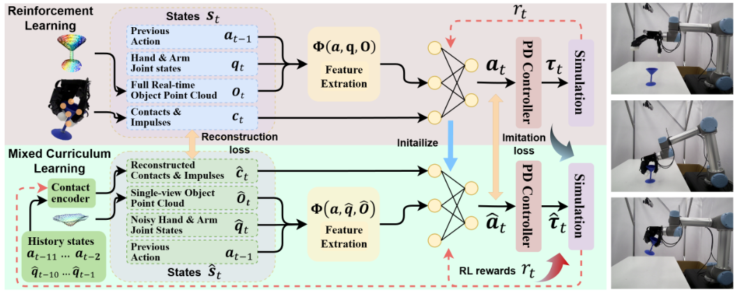 如上原文的Figure 2展示了局部几何表征、师生蒸馏、抗扰 RL 课程,解释了为何能在单视点与外界干扰下仍稳抓广域未知物体。自上而下地串起Teacher/Student 双策略与混合课程(IL→RL)训练框架:Teacher 拿特权接触/冲量 + 全量点云学会“理想抓取”;Student 只有初始单视点点云 + 噪声关节,在模仿基础上逐步切换到 RL,学习在随机干扰/观测噪声下自适应动作。输入侧的手中心距离向量表征(finger-to-surface distance),策略输出到手/臂关节目标,以及贯穿训练的接触/冲量重构损失。