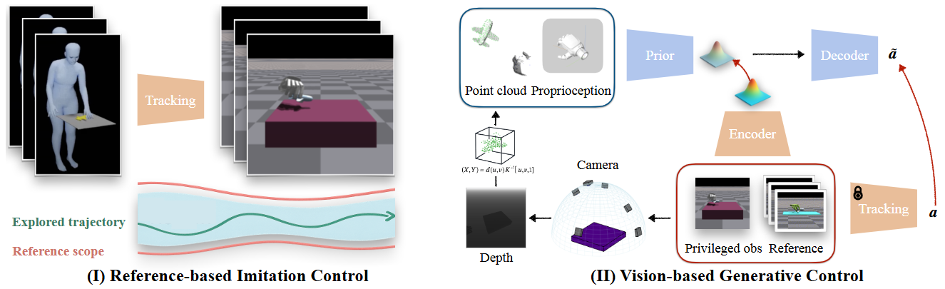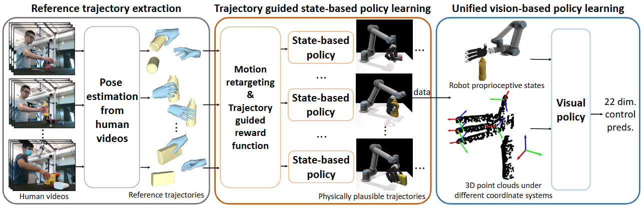 针对每段参考轨迹,作者设计了两阶段的奖励:预抓取阶段学“像人那样接近”;操作阶段同时约束手的运动与物体的期望运动/接触/抬起,并在训练中做初始化与目标的轨迹增强,把“看起来自然”的参考,优化成物理上能成功的执行轨迹。这一步输出大量成功的、可执行的“样本剧本”。 - ③ 统一视觉策略(BC 或 3D 扩散策略)