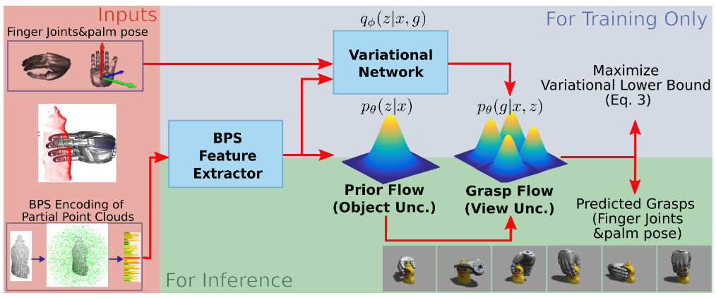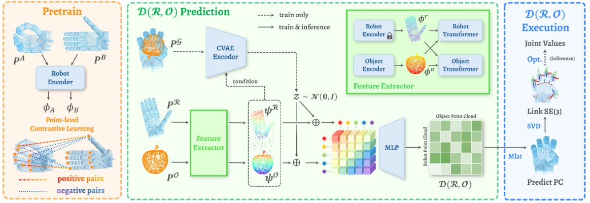 - 编码与中间特征:zξ 表示“手内位姿”编码,zψ 是“外部接触试探码”,zO 是 O 的分层激活(几何特征)。