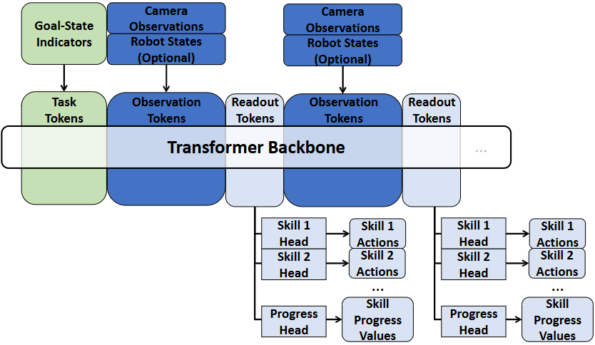 - 进度头 + 技能选择(ProGSS):独立的“进度头”同时输出每个技能的进度值(0–1);根据进度与终止阈值,ProGSS 在当前时刻选择该执行的技能。这解决了长流程里“何时切换/跳过/重试某技能”的歧义问题,也让系统能对扰动做出合理反应(如进度不达标就重做)。
