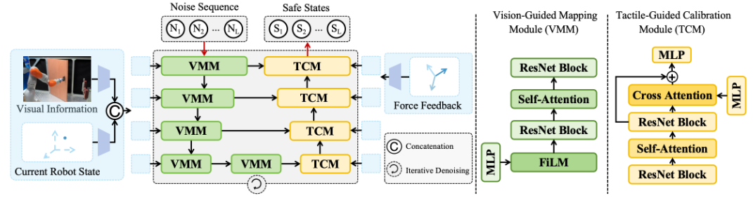 如上原文Fig. 2 : “点云/触觉编码 → 预测未来合力 → 以(当前+未来)合力做查询的跨注意力融合 → 扩散策略出动作”。接近多看视觉,触碰多看触觉,全靠力信号自适应切换。具体地,