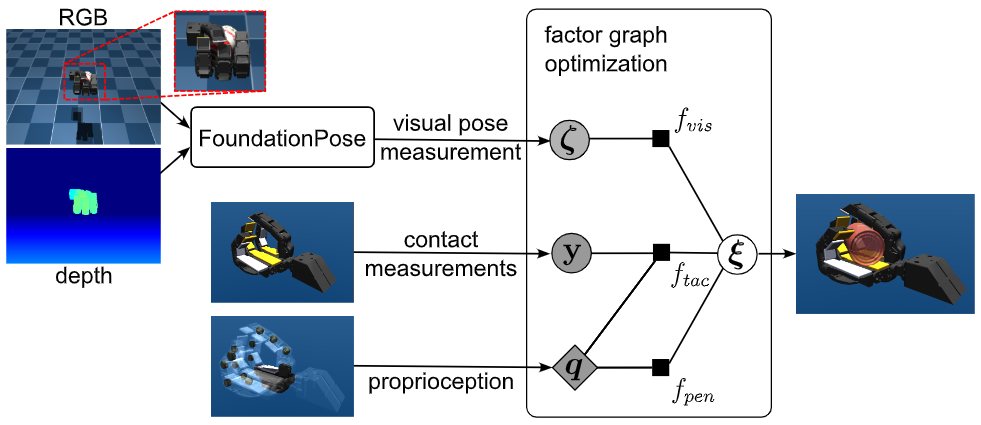 上述三类信息被统一到因子图里,对“物体位姿 ξ”做实时优化:视觉提供全局对齐,触觉提供局部接触约束,穿透项提供物理可行性。论文使用鲁棒损失下的非线性最小二乘(LM)实现,抗掉“视觉被遮挡”或“触觉误触发”的离群值。图的右侧即为输出:当前时刻的物体 6D 位姿,实测可达约 13.3 Hz 的在线更新。