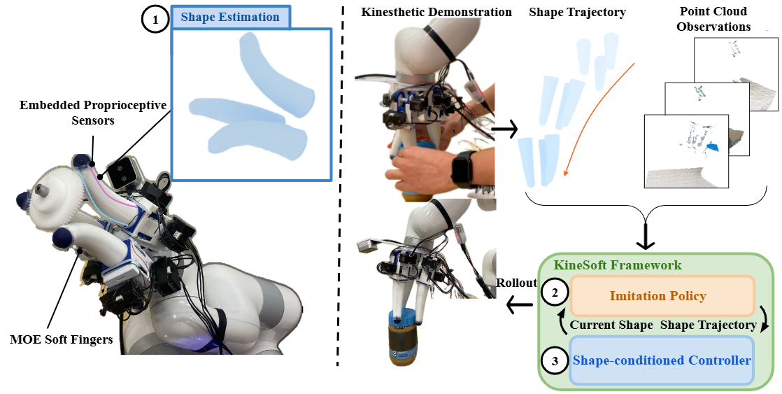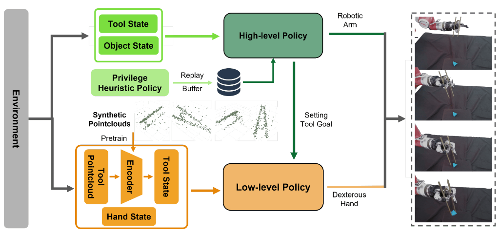 - 高层策略(定“形”+动“臂”):输入“工具状态 + 目标物体与放置目标的相对位置”,一边给低层下达下一步的工具目标形状,一边控制机械臂把手/工具送到物体附近,协调手—臂完成夹取与搬运。