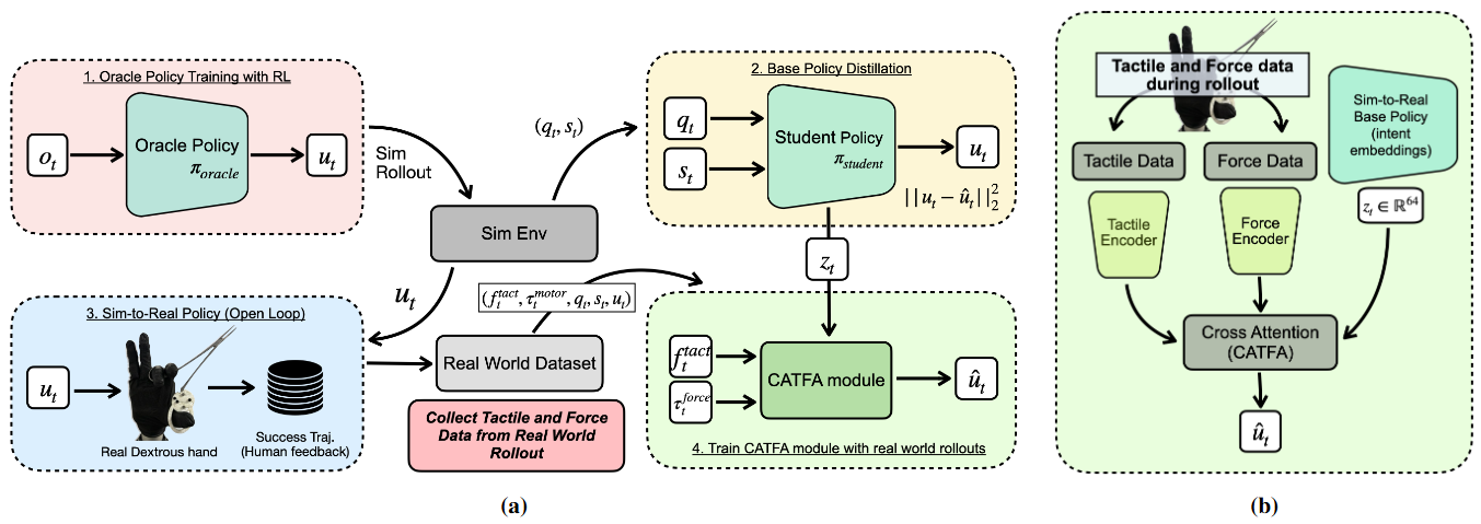 内容简介:抓刚体容易点,在手里操纵“自带机关”的工具(剪刀、钳子、腹腔镜器械)就难多了:关节摩擦/回差/空程、接触耦合等细节很难仿真。作者路线是:先在仿真用“特权观察”学一个强基模型,再蒸馏成可上机的“本体感知策略”,最后引入跨注意力的触觉-力矩自适应模块(CATFA)在真实硬件上微调 —— 一句话:用小量真机数据把“未建模接触细节”在线补齐。结果是对干扰/尺度/几何更稳健,且能泛化到没见过的新工具。
