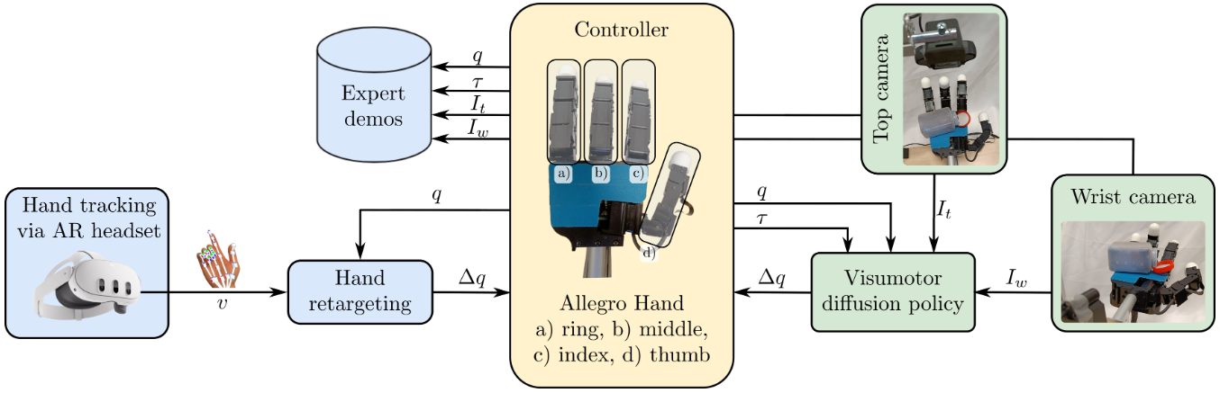 - 左侧·遥操作采集:Meta Quest 3 实时手部追踪 → Unity 经 ROS-TCP 发送骨架点位 → “手部重定向节点”做运动重定向 + 逆运动学,输出 Allegro Hand 的增量关节命令 Δq,同时记录 q(关节位置)/ τ(关节力矩或电流)/ 顶视与腕部相机图像(It, Iw),形成示范数据。这个环节确保演示精确、响应快、覆盖多姿态。