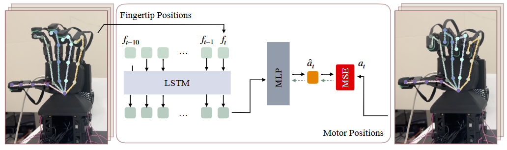 - 控制器结构(LSTM→MLP):控制器对最近若干帧的手指状态做时序编码(图中标注 ft, ft-1, …, ft-10),得到一个紧凑表示,再由 MLP 直接回归各关节的电机位置。论文实际为每根手指训练一个小模型:拇指用“指尖位姿→电机”,其余手指用“关节角→电机”,以贴合硬件/手套输出差异。