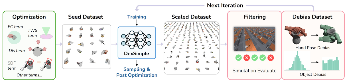 如上图,输入:对象资产(多类可操作物体)+ 手部初始姿态。 → 控制式优化先行:基于可微力闭合/任务扭矩空间等能量项合成稳定接触的关键手姿,得到Seed(小而精)。这一步用球体近似手部几何 + SDF 约束避免穿模,并在关节限幅/自身碰撞项下搜索可行抓取/操作姿态。 训练生成模型(DexSimple):用 Seed 训练条件化的 CVAE(Conditional Variational Autoencoder),并在训练中显式加入几何可行性(点-球 SDF)等约束项,使生成结果更“可执行”。 规模化采样(π 倍扩展):用 DexSimple 生成Proposal(大规模候选)。图中以比例 π 标注“从小到大”的数据放大。 可行性与去偏:对 Proposal 先过仿真评审(simulation critic)过滤不可行轨迹,再用去偏采样(debiased algorithm)刻意补齐“少见条件”(如物体表面稀疏区域/困难对象),拉高多样性,得到Debiased。 优化细化(refinement):对 Debiased 结果做轻量后优化(只调接触/穿模/距离项,微调指尖贴合),在保证效率下进一步提升物理可行性与接触质量。然后写回仿真验证。 迭代闭环 → Dex1B:将净化后的数据并入训练集,再训练更强的生成器,再扩一轮……多次迭代后,数据规模不断放大形成成功轨迹,构成 Dex1B。