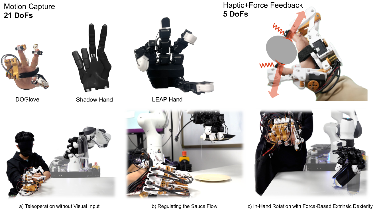 如上“Figure 1(系统示意)”把手套结构、动力传递、以及“动作/力的重定向(retargeting)”画在一张图:①上半是手套的关节/拉索示意,标出 21-DoF 动捕与 5-DoF 力反馈路径;②下半是多种真实任务的照片拼图(无视觉力控瓶身、调控粘稠液体流量、在手内翻滚等)。
