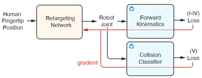 - 碰撞约束(V):并行接一个自碰撞分类器(训练好后固定),对会引发自碰的关节配置施加惩罚,鼓励无碰撞的重定向结果;同样把梯度回传到网络参数。