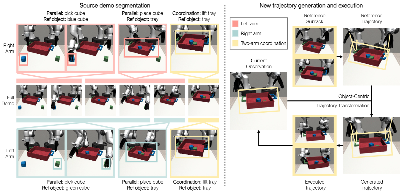 将人类遥操作得到的源示范,分别对左臂/右臂做对象中心(object-centric)的子任务分段,并记录每段的参考对象位姿;需要两臂配合的段落会被标注为“协调(coordination)子任务”,以便后续执行时对齐。 - 右侧:在新场景中“生成并执行”