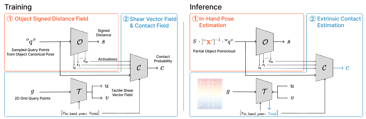 - O / T / C:三块模块——O(Object)学物体形状,T(Tactile)学触觉剪切场,C(Contact)学接触概率场。