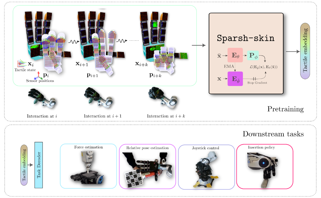 - 上排(DexSkin):机器人先抓笔、再将其顶靠柜面完成手内转正;当人手在中途旋转扰动笔后,策略能读出触觉热力图的变化(尖端圆顶与侧壁税格显著发亮),重复关键动作把笔再次立起。这说明策略确实在用空间分辨率很高的触觉分布来推断“笔在手里的姿态”,并据此闭环修正。