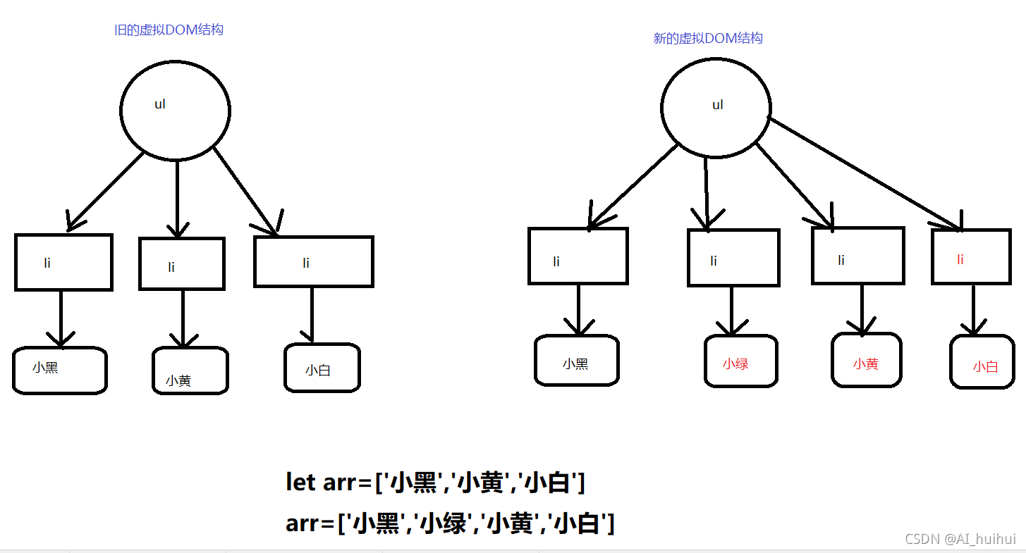 v-for先循环产生新的DOM结构, key是连续的,和数据对应然后比较新旧DOM结构,找到区别,打补丁到页面上最后补一个li,然后从第二个往后,都要更新内容。export default { data(){ return { arr: ["小黑", "小黄", "小白"] } }, methods: { addFn(){ this.arr.splice(1, 0, '小绿') } } };