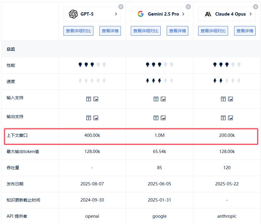 相比之下,GPT-5和Claude4Opus的上下文窗口相对较小,但在实际应用中已能满足大多数场景需求。GPT-5通过其统一架构实现了更高效的上下文利用,而Claude4Opus则通过改进的内存机制来增强长期任务处理能力。