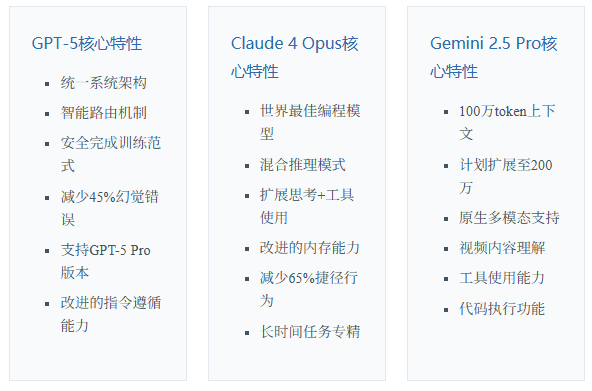 GPT-5采用统一系统架构,集成了快速模型、深度推理模型和实时路由器;Claude4Opus提供即时响应和扩展思考两种模式;而Gemini2.5Pro则以其庞大的上下文窗口成为处理长文档的首选工具。