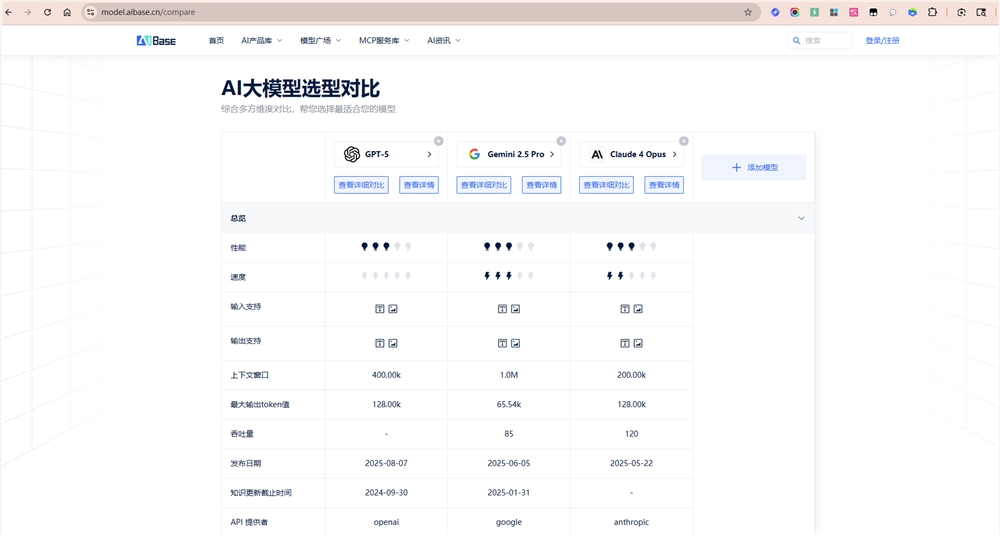 在选择合适的AI模型时,建议使用AIbase模型广场进行详细对比。该平台提供了实时的模型性能数据、价格信息和用户评价,能够帮助您根据具体需求做出最优选择。AIbase模型广场不仅支持GPT-5、Claude4Opus、Gemini2.5Pro等顶级模型的对比,还提供了丰富的测试工具和基准数据,是AI从业者和企业决策者不可多得的参考平台。通过其直观的对比界面,您可以快速了解不同模型在特定任务上的表现差异,从而做出明智的技术选择。