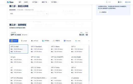打开 https://model.aibase.com/zh/calculator,国内外50+主流大模型整齐排列:从OpenAI的GPT-4o、Claude 3到国内深度求索DeepSeek、月之暗面Moonshot...点击目标模型,复杂参数库自动加载完成。