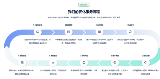 技术创新的价值最终需要通过服务体系实现转化。GEO优化服务建立了覆盖“分析-策略-实施-监测-优化”的全流程服务体系。从初始网站审计到持续优化建议,系统提供了端到端的解决方案。