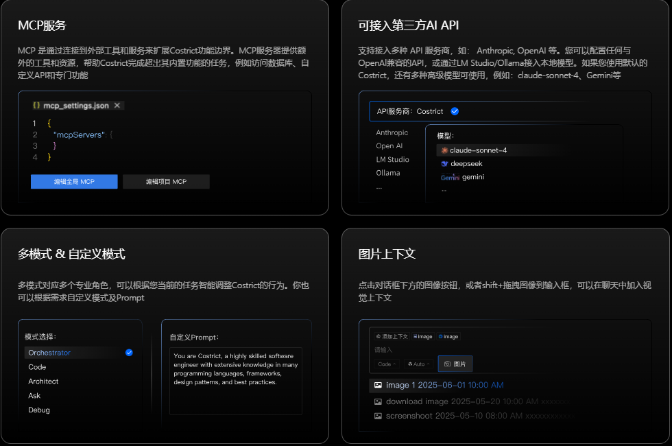 - 更多工具:Costrict支持多种外接工具,例如:MCP、自定义API/模型服务、多模式/自定义模式选择 和图片上下文等功能。