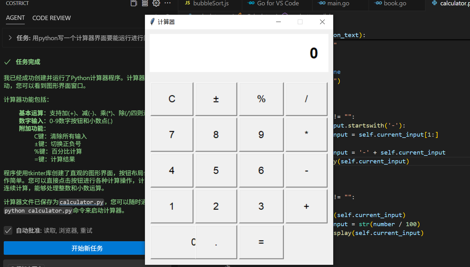 一个简单的计算器功能轻松实现了,有相应的加减乘除功能。后续可以继续提问costrict完善相应的功能,感兴趣的小伙伴可以去试试。