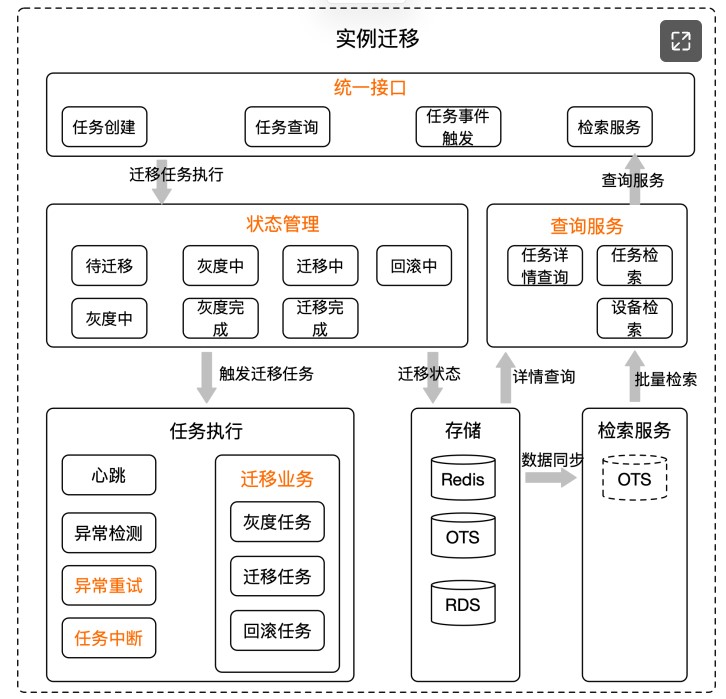- 采用异步任务方式,抽象实例迁移过程。灰度迁移、全量迁移、迁移回滚采用任务方式执行,并配合状态机业务可中断从业务维度保障稳定。
