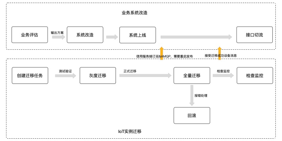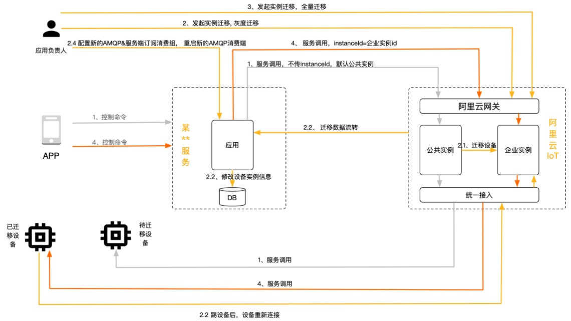 实例迁移过程,采用设备不改造,服务端少改造的方式策略,避免阿里云IoT物联网平台用户改造成本过高。