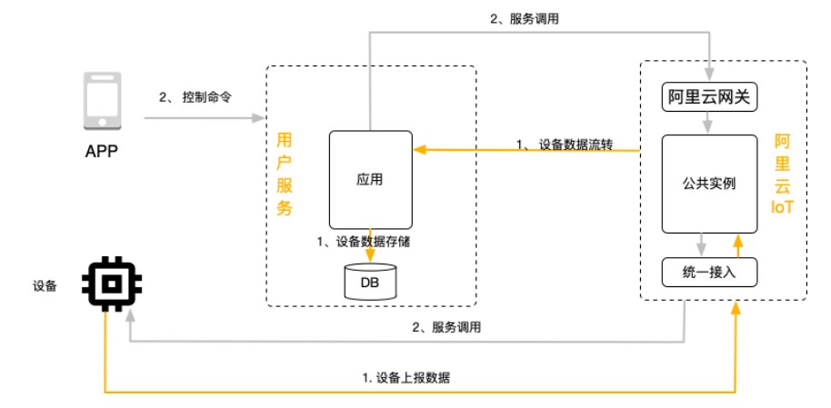 - APP连接用户应用,鉴权后开始计费。用户应用调用阿里云IoT物联网平台提供的设备控制服务,控制设备开始工作。