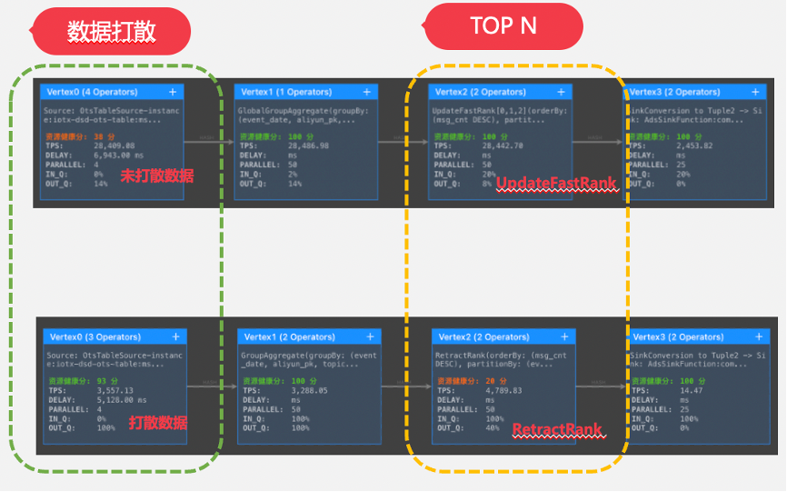 - TOPN一共有三种算法,性能从高到低分别是:UpdateFastRank、 UnaryUpdateRank和RetractRank。涉及TOP N函数时,内部算法尽量使用UpdateFastRank。会使性能更好。下图分别打散和不打散数据的性能对比和使用UpdateFastRank和RetractRank算法时的性能对比。(上下两个任务流程的数据源完全相同)
