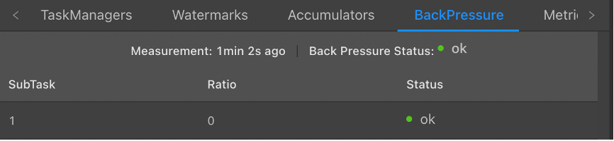 链路中的Vertex也会出现反压现象。反压是指当下游的Vertex处理数据的能力不足时,上游会停止发送数据,避免数据丢失。定位反压节点可以看IN_Q和OUT_Q指标。每个Vertex的信息中,有IN_Q和OUT_Q指标,分别表示进入队列和输出队列中元素个数/队列总长度。当一个Vertex的IN_Q满,OUT_Q空,则该节点有性能问题,会对上游的节点造成反压。另外一种方式是,在节点信息中,查看BackPressure > Status,如果是绿色ok,则不存在反压,如果是红色high,则存在反压,该节点的下游存在性能瓶颈。
