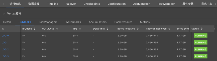 判断数据倾斜:在运行信息 > Vertex拓扑中选中一个节点后,在右侧的详细页面中选择SubTasks,查看是否出现数据倾斜问题。观察每个task的In Queue, Bytes Received和Records Received。如果某一两个Task的In Queue百分比或者Bytes Received特别高,和其他的task的In Queue形成明显差别,尤其当某个task In Queue的百分比长期为100%,其他的为0%,则出现了数据倾斜。