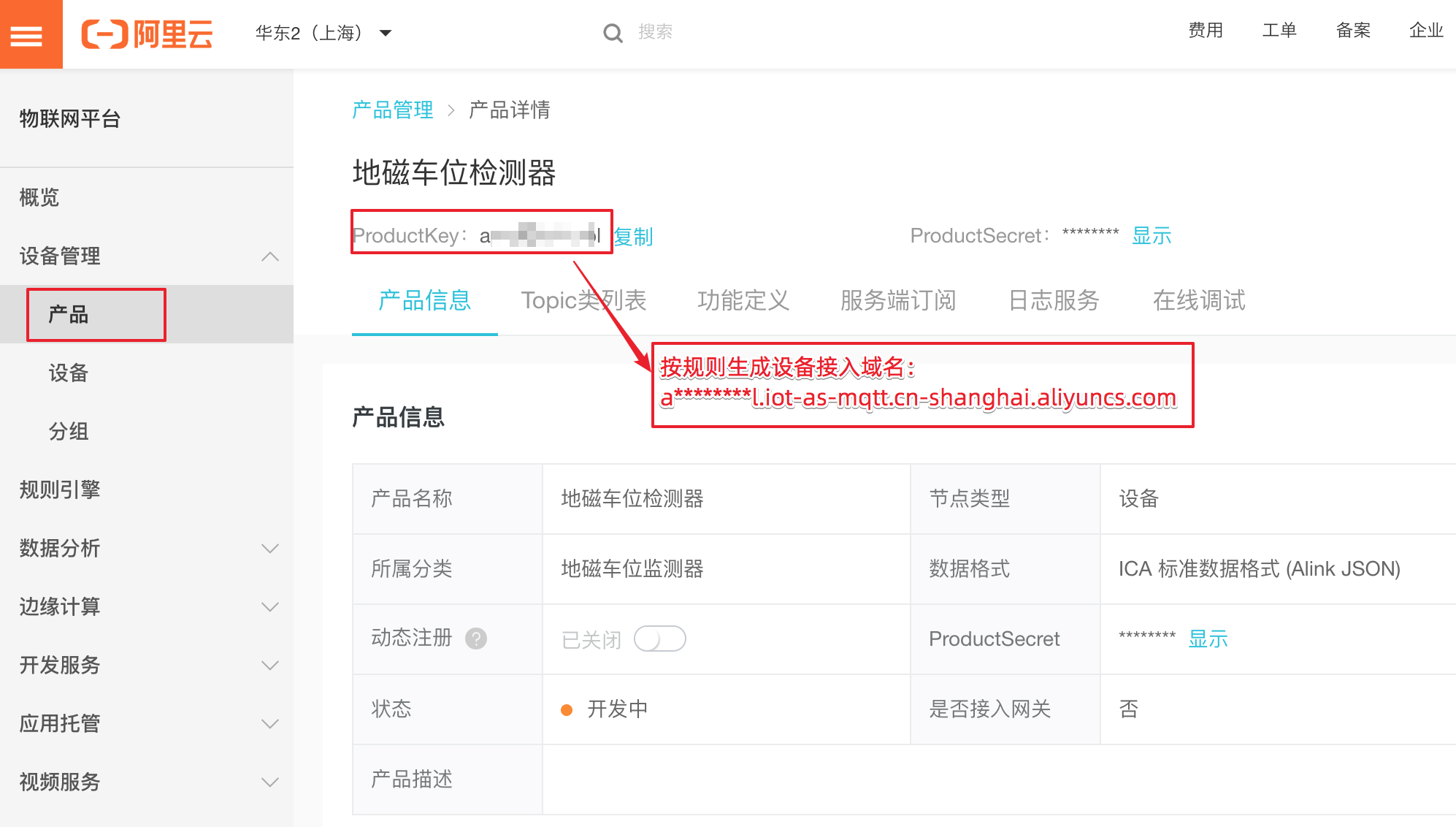 但我们在IoT物联网平台控制台创建产品后,会生成对应设备接入指定域名,参考下图:
