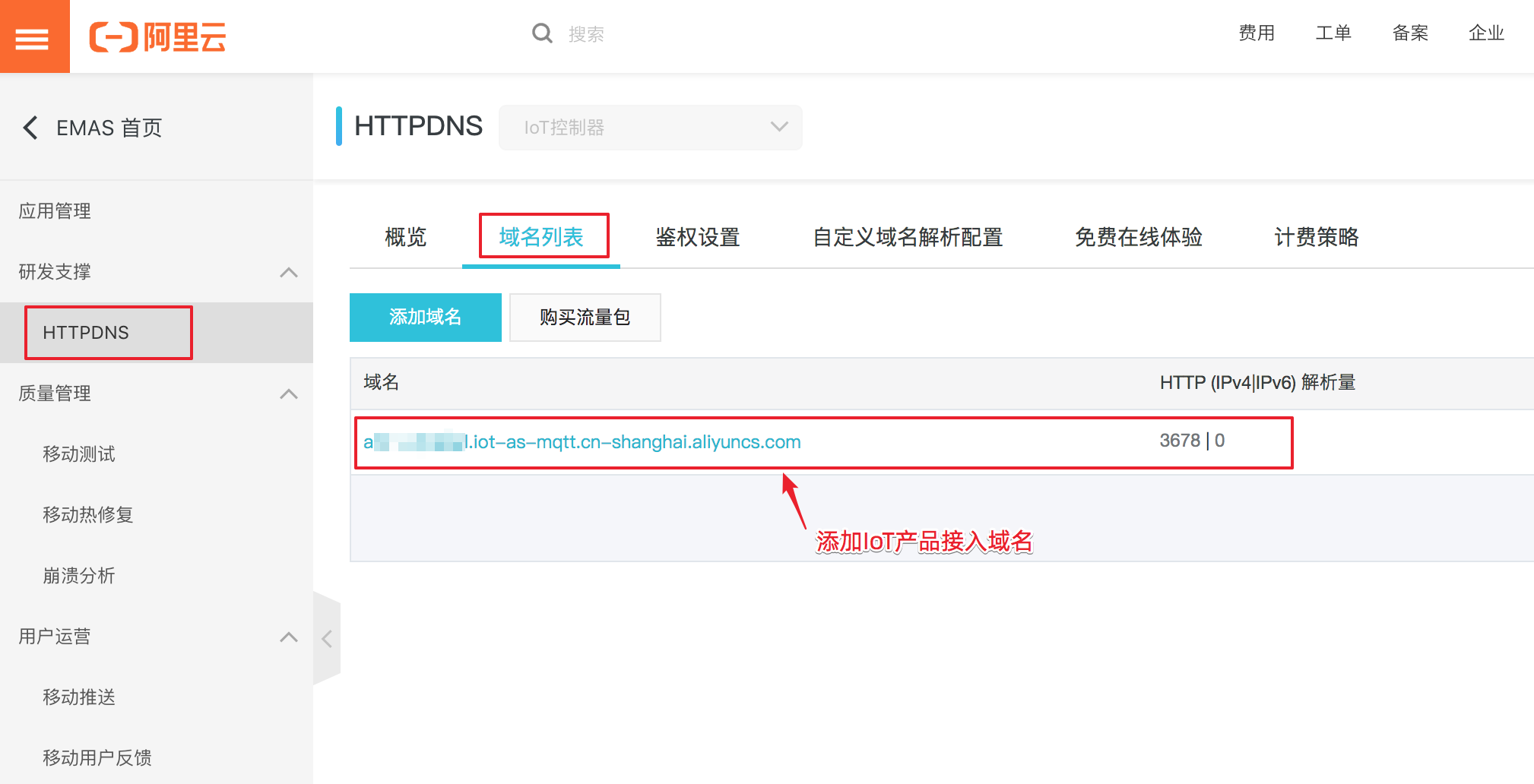 接下来我们要在HTTPDNS的控制台,添加IoT物联网设备的接入域名解析服务,参考下图: