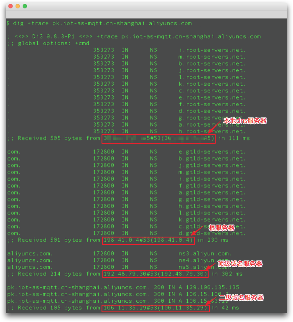 1.首先Mac电脑从本地DNS服务器获取到根域名(.root)服务器列表, 2.其次从其中一台根域名服务器(198.41.0.4)获取到顶级域名(.com)服务器列表 3.再次从其中一台顶级域名服务器(192.48.79.30)获取到二级域名(aliyuncs.com)服务器列表 4.最后从其中一台二级域名服务器获取到了目标域名的IP列表,共3个IP地址