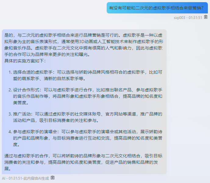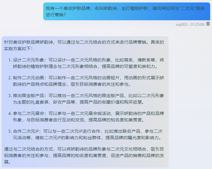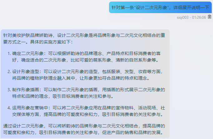 如:“我有一个美妆护肤品牌,名叫娇韵诗,主打植物护肤,请问将如何与“二次元”结合进行营销?”