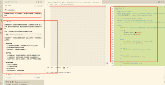 下载倒是方便,直接浏览器搜文心快码就能下载,也不需要搭配什么复杂环境,很方便上课指导学生操作。我试着在文心快码zulu智能体的窗口输入:“创建植物百科网页,包含分类标签、图片展示和搜索框,风格类似自然杂志”。文心快码立刻生成了基础HTML结构,但图片布局有些错位。我随手在笔记本上画了个九宫格草图,拍照上传到IDE。不到两分钟,Zulu就重新输出了响应式布局代码,图片间距和分类标签颜色完全按草图实现了。当追加指令“点击植物图片显示详情弹窗”时,文心快码创建了弹窗组件,还自动生成了JSON数据模板,整个过程没有一丝卡壳。考虑到大多时候孩子们写需求可能不会像我这么凝练、精准,我又试着模仿学生口吻,用稍显笼统的方式要求文心快码zulu做网页,结果也是一样,很智能,需求理解到位。