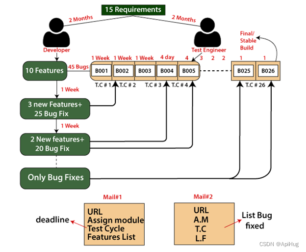 从一个需求出发, 开发和测试在两个线上进行, 通过构建的版本不停的往复,最终达到一个软件交付的标准;