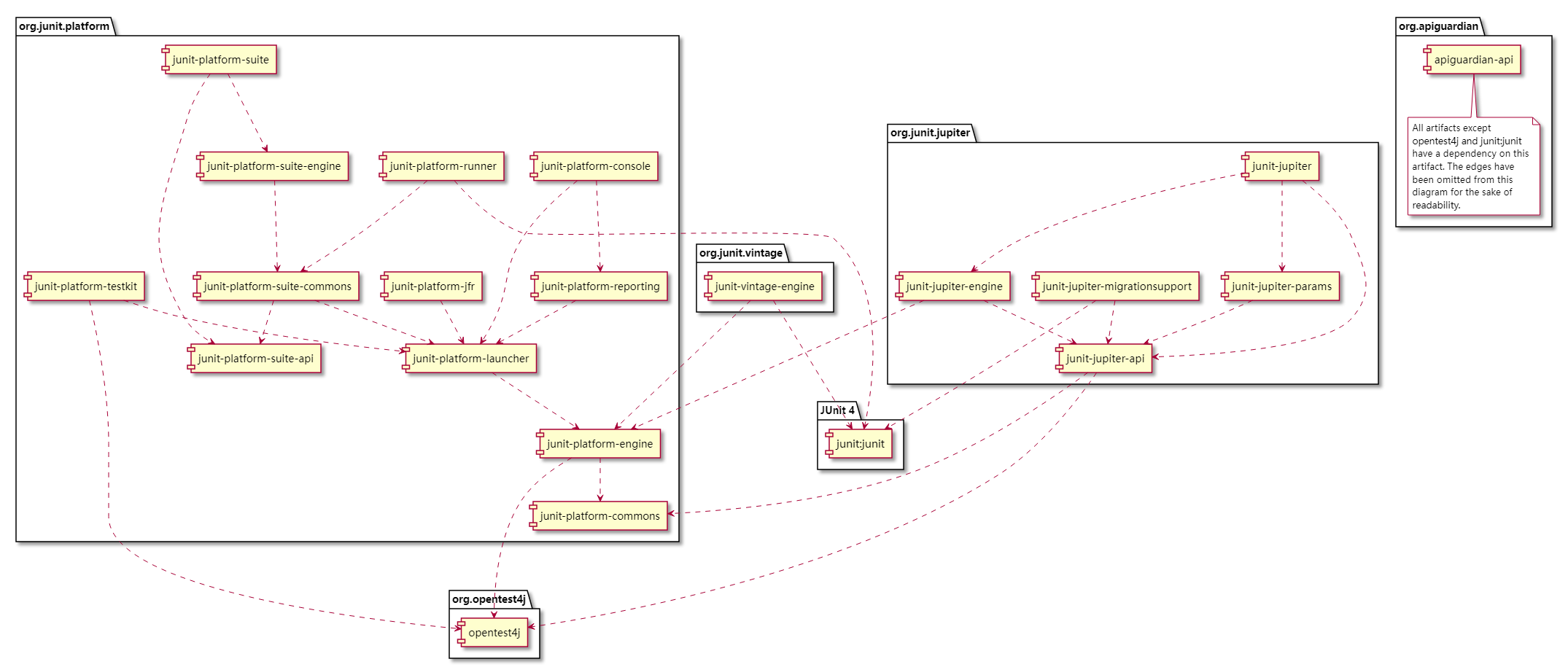这个图可以更具体看出 Junit5 在逻辑层, 和各个包的分布关系图: