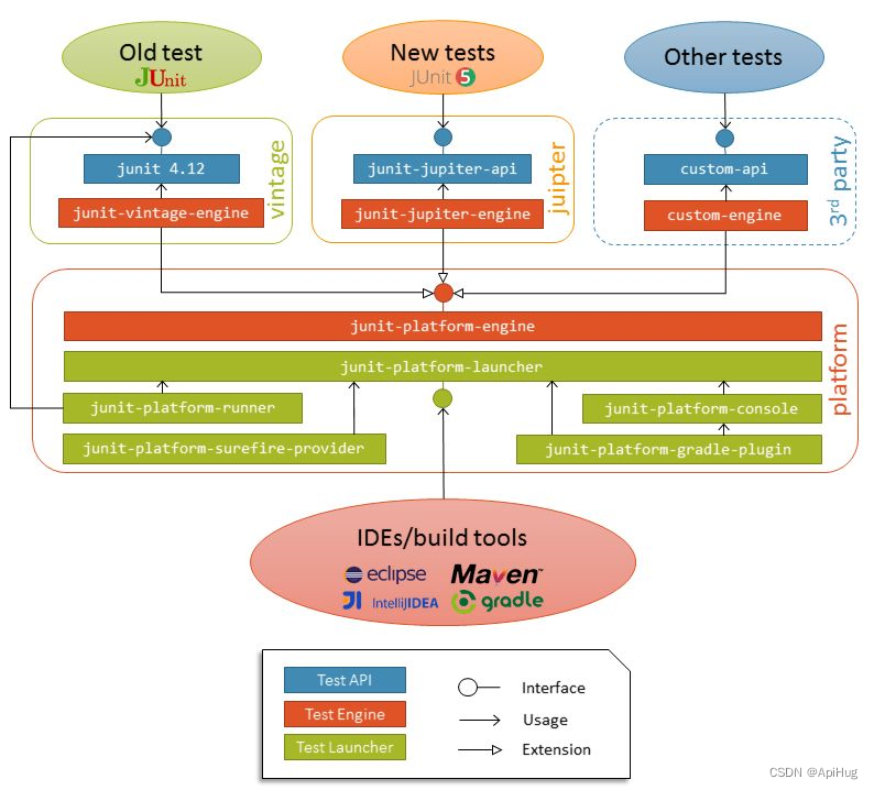 - JUnit Platform: 用于JVM上启动测试框架的基础服务,提供命令行,IDE和构建工具等方式执行测试的支持。