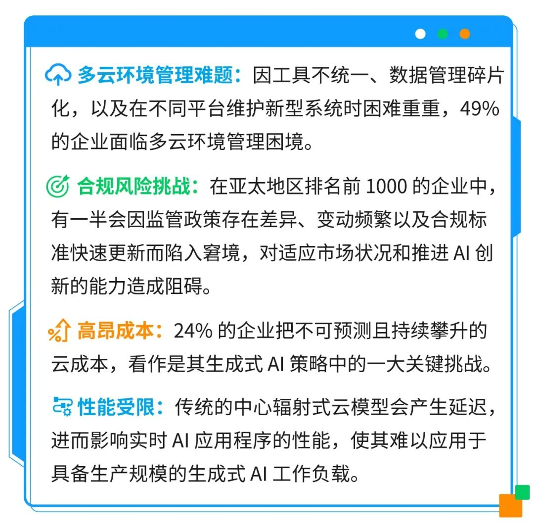 在生成式 AI 从实验阶段转向实施阶段的同时,亚太地区的企业正面临着传统基础架构的局限性问题。现在,该地区 31% 的受访企业已经在生产环境中部署了生成式 AI 应用程序。与此同时,64% 的企业正处于测试或试点阶段,尝试将生成式AI应用于面向客户和内部的场景。然而,这种快速发展的势头也暴露出了现有云架构中存在的严重差距: