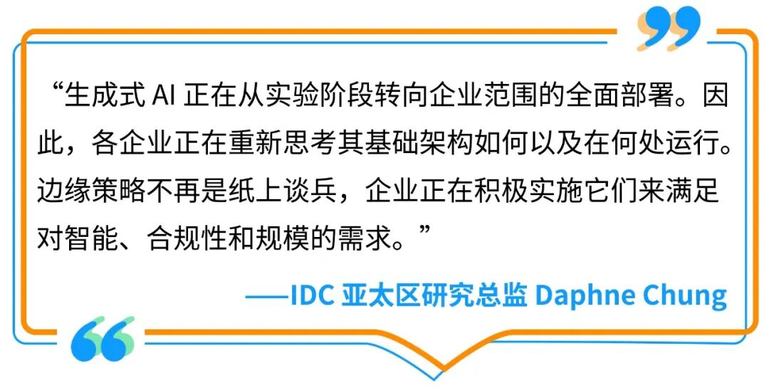 随着生成式AI技术的发展,应用场景不断拓宽,企业对基础架构的需求也随之发生变化。近期,IDC《边缘演进: 从核心到边缘赋能成功》研究报告表明,亚太地区 (APAC) 的企业逐渐认识到,仅依靠集中式云架构无法满足在规模、速度和合规性方面日益增长的需求,企业必须重新思考并改进基础架构策略以纳入边缘服务,从而保持竞争力和合规性,并为 AI 的实际部署做好准备。