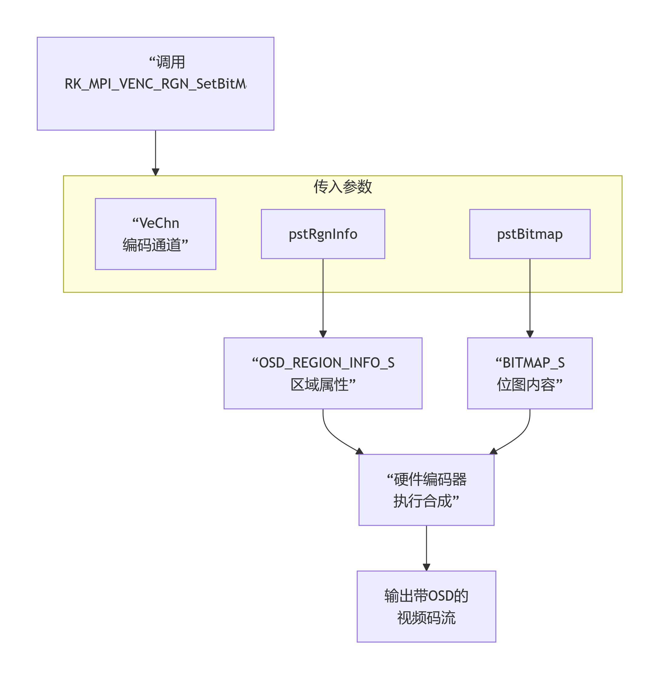 这个函数是RV1126平台媒体处理接口(MPI)中,用于将位图设置到视频编码器的指定叠加区域的核心函数。它完成了OSD叠加的“最后一公里”,即将准备好的内容和区域进行绑定。