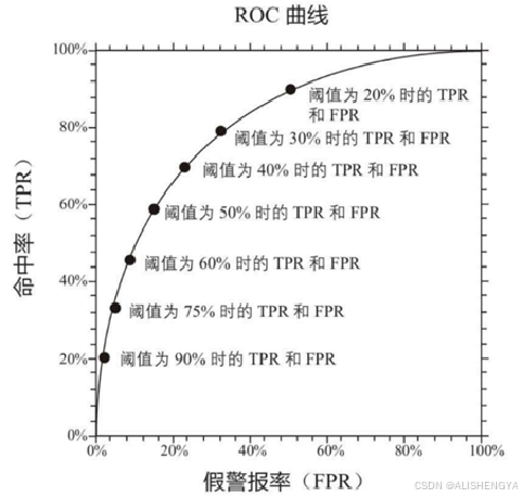 ☛假阳性率(FPR):假设数据集中有100张狗的图片。当阈值为0.5 时,模型错误地把30张狗的图片判断为猫,那么假阳性率(FPR) =错误判断为猫的狗图片数÷总狗图片数=30÷100=0.3。这好比在一堆普通石头(狗图片)中,我们错误地把石头当作宝藏(猫)的比例。