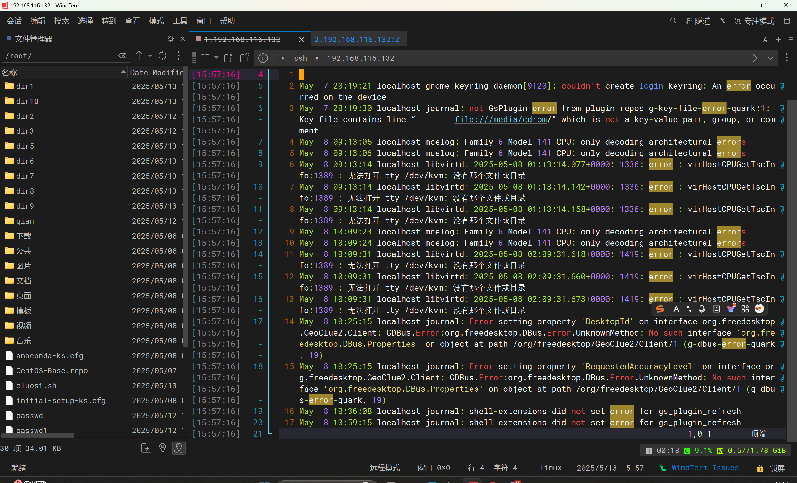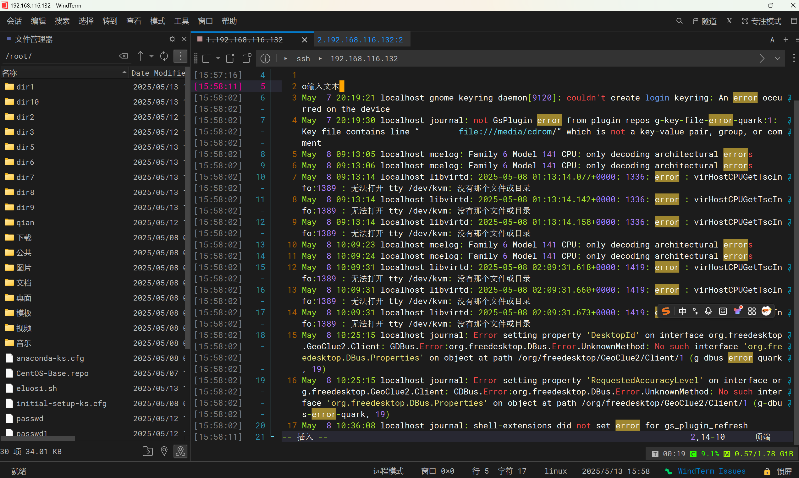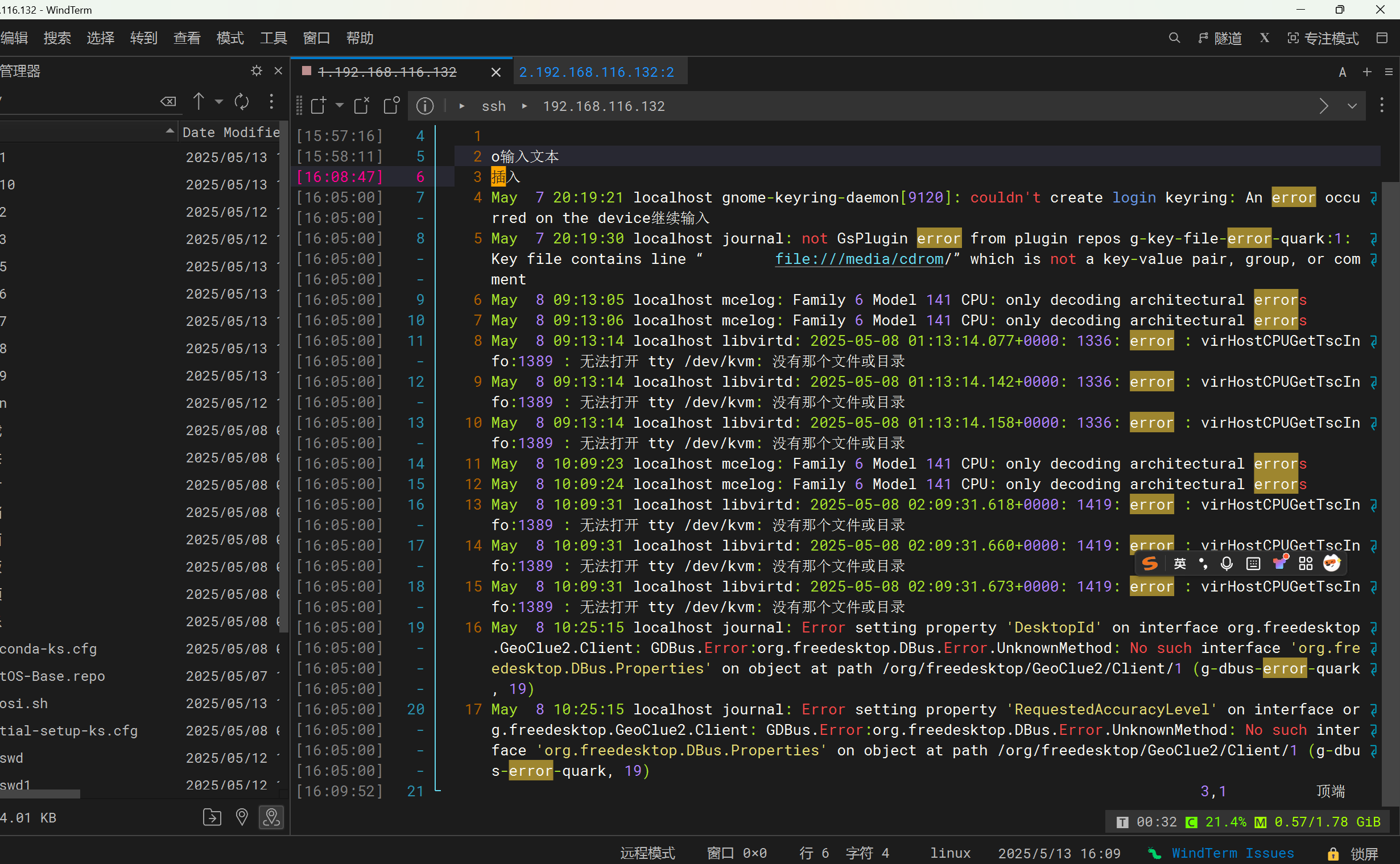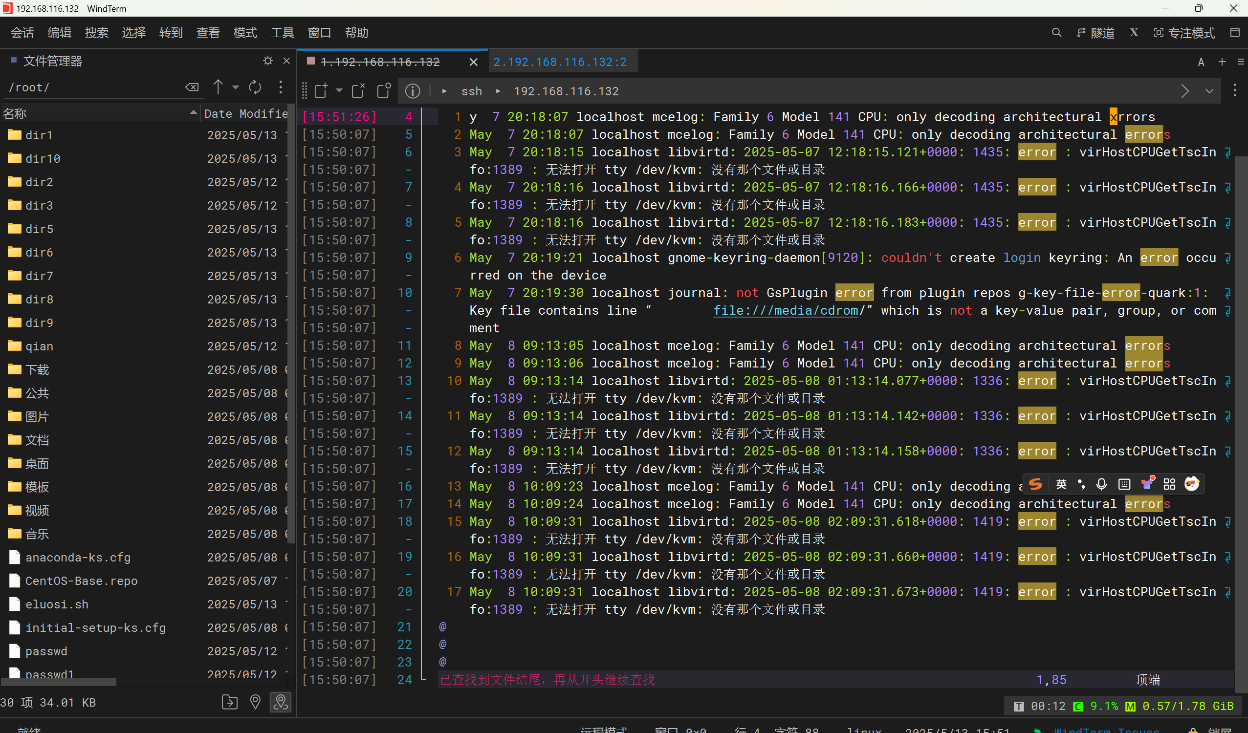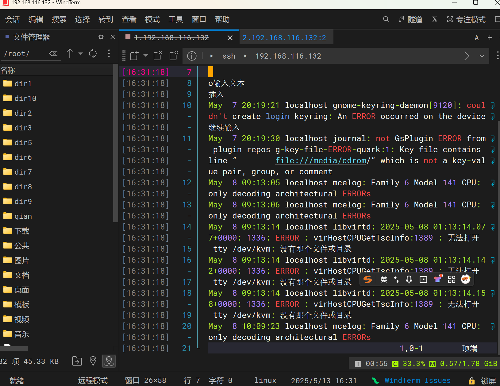 May 7 20:18:07 localhost mcelog: Family 6 Model 141 CPU: only decoding architectural errors May 7 20:18:07 localhost mcelog: Family 6 Model 141 CPU: only decoding architectural errors May 7 20:18:15 localhost libvirtd: 2025-05-07 12:18:15.121+0000: 1435: error : virHostCPUGetTscInfo:1389 : 无法打开 tty /dev/kvm: 没有那个文件或目录 May 7 20:18:16 localhost libvirtd: 2025-05-07 12:18:16.166+0000: 1435: error : virHostCPUGetTscInfo:1389 : 无法打开 tty /dev/kvm: 没有那个文件或目录 May 7 20:18:16 localhost libvirtd: 2025-05-07 12:18:16.183+0000: 1435: error : virHostCPUGetTscInfo:1389 : 无法打开 tty /dev/kvm: 没有那个文件或目录 May 7 20:19:21 localhost gnome-keyring-daemon[9120]: couldn't create login keyring: An error occurred on the device May 7 20:19:30 localhost journal: not GsPlugin error from plugin repos g-key-file-error-quark:1: Key file contains line “ file:///media/cdrom/” which is not a key-value pair, group, or comment May 8 09:13:05 localhost mcelog: Family 6 Model 141 CPU: only decoding architectural errors May 8 09:13:06 localhost mcelog: Family 6 Model 141 CPU: only decoding architectural errors May 8 09:13:14 localhost libvirtd: 2025-05-08 01:13:14.077+0000: 1336: error : virHostCPUGetTscInfo:1389 : 无法打开 tty /dev/kvm: 没有那个文件或目录 May 8 09:13:14 localhost libvirtd: 2025-05-08 01:13:14.142+0000: 1336: error : virHostCPUGetTscInfo:1389 : 无法打开 tty /dev/kvm: 没有那个文件或目录 May 8 09:13:14 localhost libvirtd: 2025-05-08 01:13:14.158+0000: 1336: error : virHostCPUGetTscInfo:1389 : 无法打开 tty /dev/kvm: 没有那个文件或目录 May 8 10:09:23 localhost mcelog: Family 6 Model 141 CPU: only decoding architectural errors May 8 10:09:24 localhost mcelog: Family 6 Model 141 CPU: only decoding architectural errors May 8 10:09:31 localhost libvirtd: 2025-05-08 02:09:31.618+0000: 1419: error : virHostCPUGetTscInfo:1389 : 无法打开 tty /dev/kvm: 没有那个文件或目录 May 8 10:09:31 localhost libvirtd: 2025-05-08 02:09:31.660+0000: 1419: error : virHostCPUGetTscInfo:1389 : 无法打开 tty /dev/kvm: 没有那个文件或目录 May 8 10:09:31 localhost libvirtd: 2025-05-08 02:09:31.673+0000: 1419: error : virHostCPUGetTscInfo:1389 : 无法打开 tty /dev/kvm: 没有那个文件或目录 May 8 10:25:15 localhost journal: Error setting property 'DesktopId' on interface org.freedesktop.GeoClue2.Client: GDBus.Error:org.freedesktop.DBus.Error.UnknownMethod: No such interface 'org.freedesktop.DBus.Properties' on object at path /org/freedesktop/GeoClue2/Client/1 (g-dbus-error-quark, 19) May 8 10:25:15 localhost journal: Error setting property 'RequestedAccuracyLevel' on interface org.freedesktop.GeoClue2.Client: GDBus.Error:org.freedesktop.DBus.Error.UnknownMethod: No such interface 'org.freedesktop.DBus.Properties' on object at path /org/freedesktop/GeoClue2/Client/1 (g-dbus-error-quark, 19) May 8 10:36:08 localhost journal: shell-extensions did not set error for gs_plugin_refresh May 8 10:59:15 localhost journal: shell-extensions did not set error for gs_plugin_refresh May 9 09:25:48 localhost journal: shell-extensions did not set error for gs_plugin_refresh May 9 14:54:18 zhao mcelog: Family 6 Model 141 CPU: only decoding architectural errors May 9 14:54:18 zhao mcelog: Family 6 Model 141 CPU: only decoding architectural errors May 9 14:54:40 zhao libvirtd: 2025-05-09 06:54:40.641+0000: 2078: error : virHostCPUGetTscInfo:1389 : 无法打开 tty /dev/kvm: 没有那个文件或目录 May 9 14:54:40 zhao libvirtd: 2025-05-09 06:54:40.660+0000: 2078: error : virHostCPUGetTscInfo:1389 : 无法打开 tty /dev/kvm: 没有那个文件或目录 May 9 14:54:40 zhao libvirtd: 2025-05-09 06:54:40.662+0000: 2078: error : virHostCPUGetTscInfo:1389 : 无法打开 tty /dev/kvm: 没有那个文件或目录 May 12 11:01:44 zhao journal: not GsPlugin error from plugin repos g-key-file-error-quark:1: Key file contains line “ http://mirrors.aliyuncs.com/centos/$releasever/os/$basearch/” which is not a key-value pair, group, or comment May 12 11:01:53 zhao journal: shell-extensions did not set error for gs_plugin_refresh May 12 11:06:04 zhao journal: shell-extensions did not set error for gs_plugin_refresh May 12 11:08:23 zhao rz[19211]: [root] deepin-desktop-community-20.9-amd64.iso/ZMODEM: error: zgethdr returned TIMEOUT May 12 11:08:23 zhao rz[19211]: [root] deepin-desktop-community-20.9-amd64.iso/ZMODEM: error May 12 11:08:23 zhao rz[19211]: [root] no.name/ZMODEM: got error May 13 10:12:48 zhao gnome-keyring-daemon[16982]: couldn't create login keyring: An error occurred on the device May 13 11:59:41 zhao libvirtd: 2025-05-13 03:59:41.571+0000: 1312: error : virFirewallApplyRuleFirewallD:790 : The name org.fedoraproject.FirewallD1 was not provided by any .service files May 13 13:30:02 zhao systemd: Started Session 207 of user root. May 13 13:36:27 zhao dhclient[1244]: DHCPREQUEST on ens33 to 192.168.158.254 port 67 (xid=0x391a628f) May 13 13:36:27 zhao dhclient[1244]: DHCPACK from 192.168.158.254 (xid=0x391a628f) May 13 13:36:29 zhao dhclient[1244]: bound to 192.168.158.30 -- renewal in 698 seconds. May 13 13:40:01 zhao systemd: Started Session 208 of user root. May 13 13:48:07 zhao dhclient[1244]: DHCPREQUEST on ens33 to 192.168.158.254 port 67 (xid=0x391a628f) May 13 13:48:07 zhao dhclient[1244]: DHCPACK from 192.168.158.254 (xid=0x391a628f) May 13 13:48:09 zhao dhclient[1244]: bound to 192.168.158.30 -- renewal in 859 seconds. May 13 13:50:01 zhao systemd: Started Session 209 of user root. May 13 14:00:01 zhao systemd: Started Session 210 of user root. May 13 14:01:01 zhao systemd: Started Session 211 of user root. May 13 14:02:28 zhao dhclient[1244]: DHCPREQUEST on ens33 to 192.168.158.254 port 67 (xid=0x391a628f) May 13 14:02:28 zhao dhclient[1244]: DHCPACK from 192.168.158.254 (xid=0x391a628f) May 13 14:02:30 zhao dhclient[1244]: bound to 192.168.158.30 -- renewal in 687 seconds. May 13 14:10:01 zhao sys