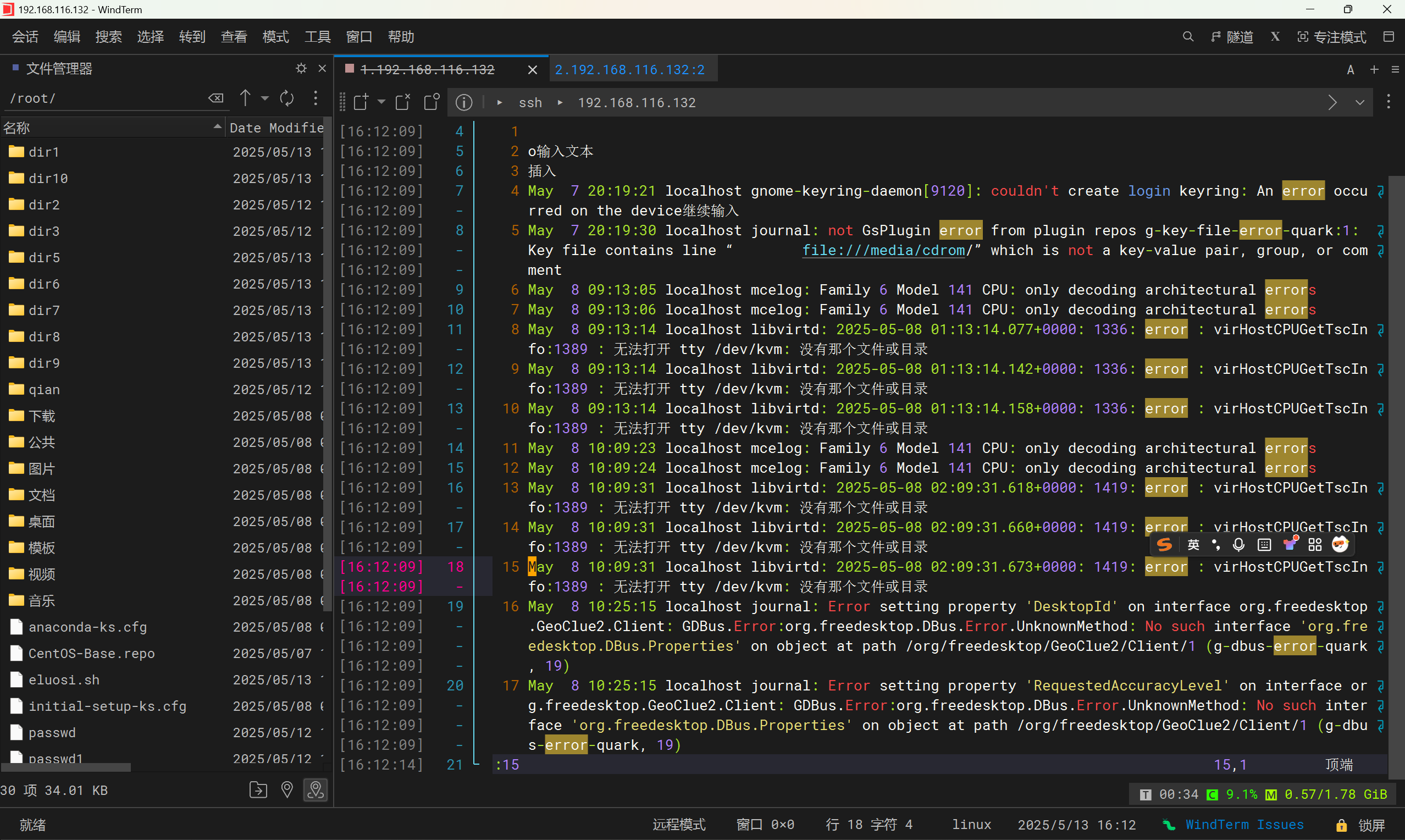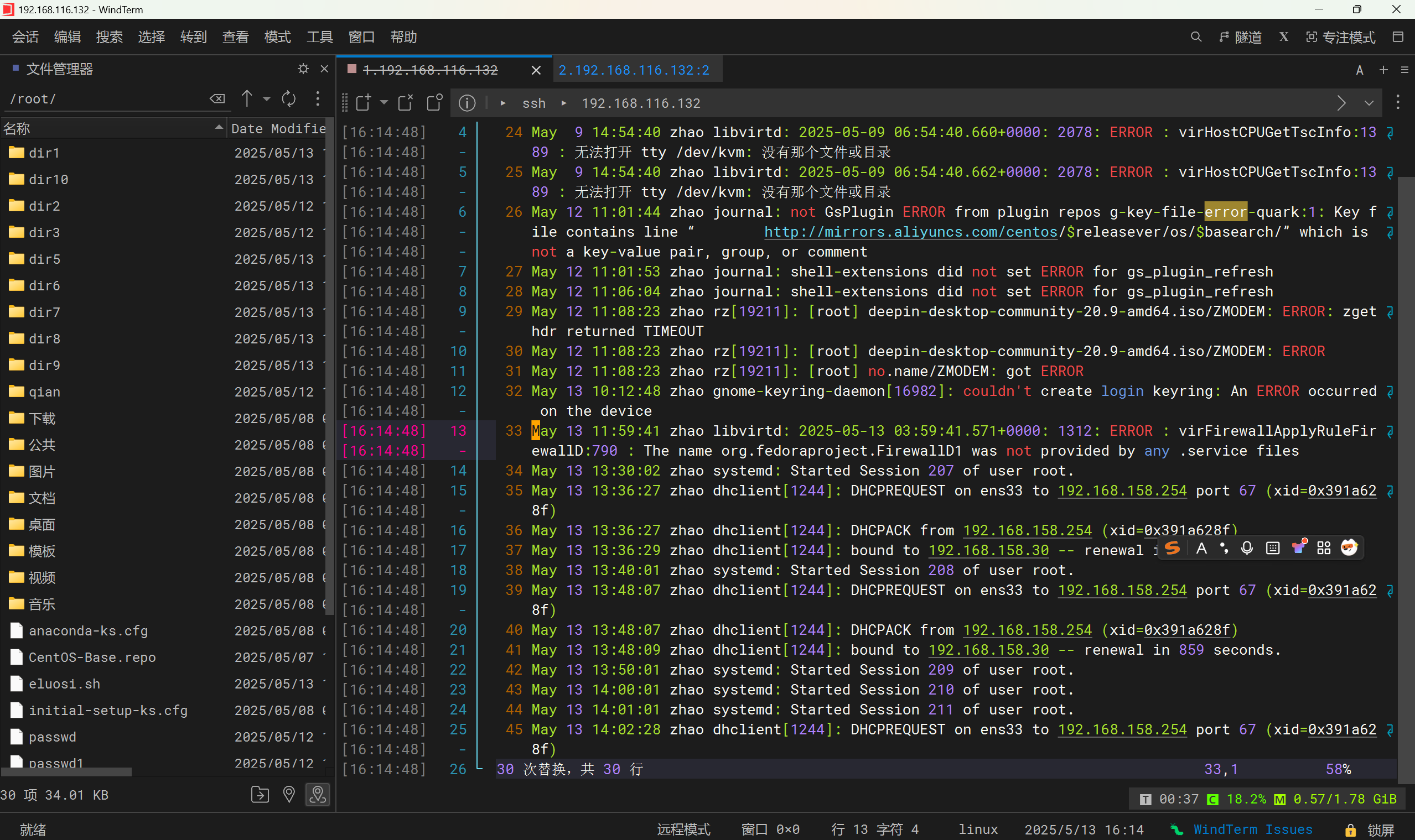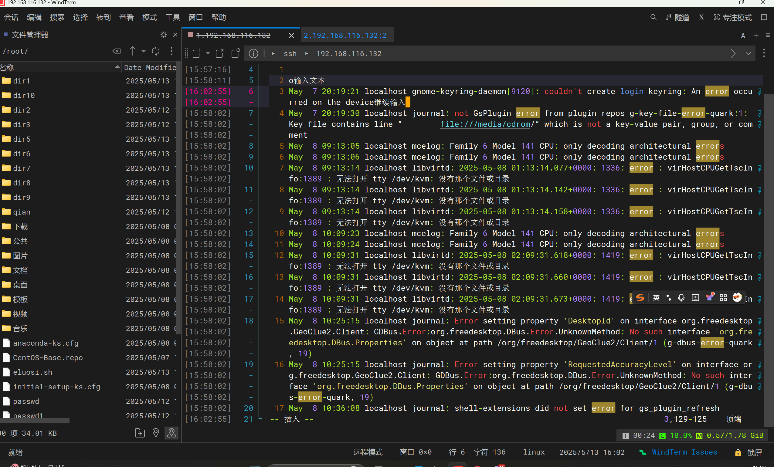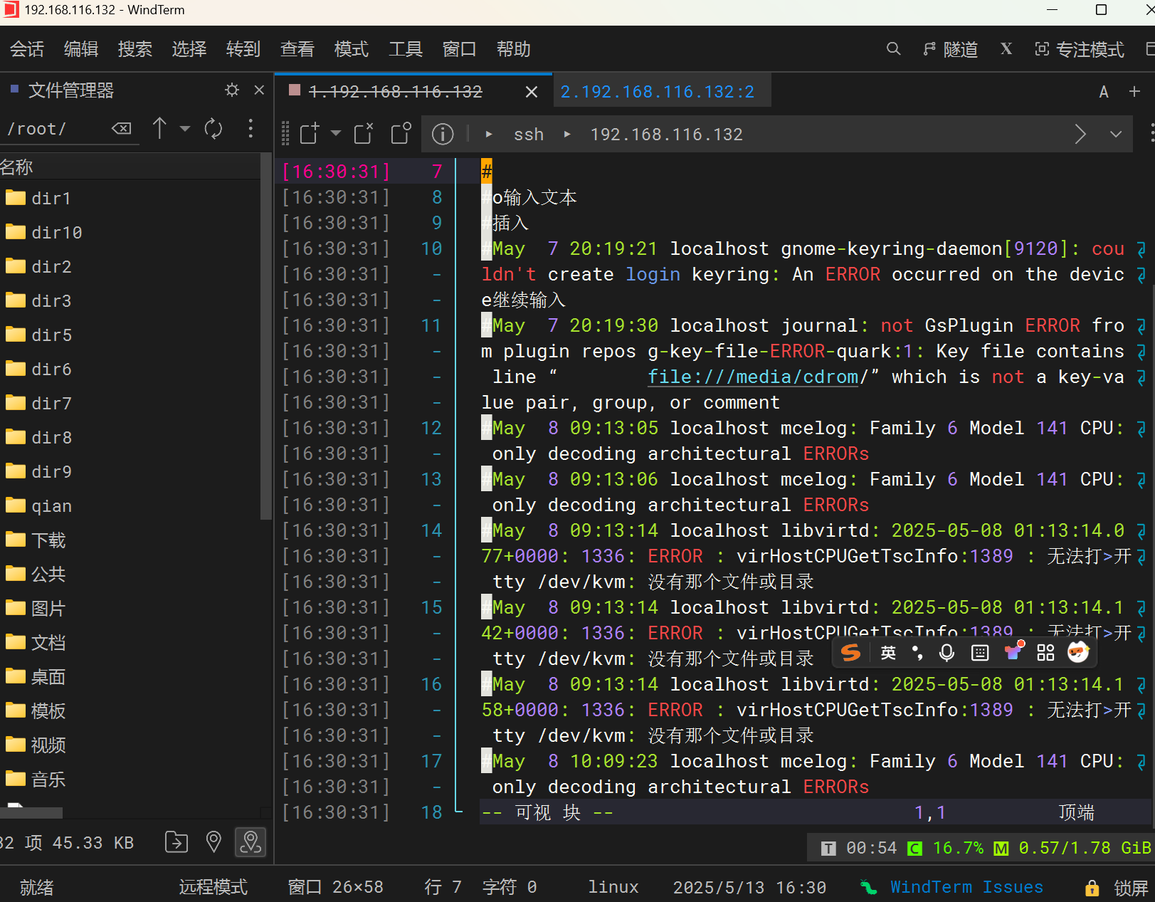May 7 20:18:07 localhost mcelog: Family 6 Model 141 CPU: only decoding architectural errors May 7 20:18:07 localhost mcelog: Family 6 Model 141 CPU: only decoding architectural errors May 7 20:18:15 localhost libvirtd: 2025-05-07 12:18:15.121+0000: 1435: error : virHostCPUGetTscInfo:1389 : 无法打开 tty /dev/kvm: 没有那个文件或目录 May 7 20:18:16 localhost libvirtd: 2025-05-07 12:18:16.166+0000: 1435: error : virHostCPUGetTscInfo:1389 : 无法打开 tty /dev/kvm: 没有那个文件或目录 May 7 20:18:16 localhost libvirtd: 2025-05-07 12:18:16.183+0000: 1435: error : virHostCPUGetTscInfo:1389 : 无法打开 tty /dev/kvm: 没有那个文件或目录 May 7 20:19:21 localhost gnome-keyring-daemon[9120]: couldn't create login keyring: An error occurred on the device May 7 20:19:30 localhost journal: not GsPlugin error from plugin repos g-key-file-error-quark:1: Key file contains line “ file:///media/cdrom/” which is not a key-value pair, group, or comment May 8 09:13:05 localhost mcelog: Family 6 Model 141 CPU: only decoding architectural errors May 8 09:13:06 localhost mcelog: Family 6 Model 141 CPU: only decoding architectural errors May 8 09:13:14 localhost libvirtd: 2025-05-08 01:13:14.077+0000: 1336: error : virHostCPUGetTscInfo:1389 : 无法打开 tty /dev/kvm: 没有那个文件或目录 May 8 09:13:14 localhost libvirtd: 2025-05-08 01:13:14.142+0000: 1336: error : virHostCPUGetTscInfo:1389 : 无法打开 tty /dev/kvm: 没有那个文件或目录 May 8 09:13:14 localhost libvirtd: 2025-05-08 01:13:14.158+0000: 1336: error : virHostCPUGetTscInfo:1389 : 无法打开 tty /dev/kvm: 没有那个文件或目录 May 8 10:09:23 localhost mcelog: Family 6 Model 141 CPU: only decoding architectural errors May 8 10:09:24 localhost mcelog: Family 6 Model 141 CPU: only decoding architectural errors May 8 10:09:31 localhost libvirtd: 2025-05-08 02:09:31.618+0000: 1419: error : virHostCPUGetTscInfo:1389 : 无法打开 tty /dev/kvm: 没有那个文件或目录 May 8 10:09:31 localhost libvirtd: 2025-05-08 02:09:31.660+0000: 1419: error : virHostCPUGetTscInfo:1389 : 无法打开 tty /dev/kvm: 没有那个文件或目录 May 8 10:09:31 localhost libvirtd: 2025-05-08 02:09:31.673+0000: 1419: error : virHostCPUGetTscInfo:1389 : 无法打开 tty /dev/kvm: 没有那个文件或目录 May 8 10:25:15 localhost journal: Error setting property 'DesktopId' on interface org.freedesktop.GeoClue2.Client: GDBus.Error:org.freedesktop.DBus.Error.UnknownMethod: No such interface 'org.freedesktop.DBus.Properties' on object at path /org/freedesktop/GeoClue2/Client/1 (g-dbus-error-quark, 19) May 8 10:25:15 localhost journal: Error setting property 'RequestedAccuracyLevel' on interface org.freedesktop.GeoClue2.Client: GDBus.Error:org.freedesktop.DBus.Error.UnknownMethod: No such interface 'org.freedesktop.DBus.Properties' on object at path /org/freedesktop/GeoClue2/Client/1 (g-dbus-error-quark, 19) May 8 10:36:08 localhost journal: shell-extensions did not set error for gs_plugin_refresh May 8 10:59:15 localhost journal: shell-extensions did not set error for gs_plugin_refresh May 9 09:25:48 localhost journal: shell-extensions did not set error for gs_plugin_refresh May 9 14:54:18 zhao mcelog: Family 6 Model 141 CPU: only decoding architectural errors May 9 14:54:18 zhao mcelog: Family 6 Model 141 CPU: only decoding architectural errors May 9 14:54:40 zhao libvirtd: 2025-05-09 06:54:40.641+0000: 2078: error : virHostCPUGetTscInfo:1389 : 无法打开 tty /dev/kvm: 没有那个文件或目录 May 9 14:54:40 zhao libvirtd: 2025-05-09 06:54:40.660+0000: 2078: error : virHostCPUGetTscInfo:1389 : 无法打开 tty /dev/kvm: 没有那个文件或目录 May 9 14:54:40 zhao libvirtd: 2025-05-09 06:54:40.662+0000: 2078: error : virHostCPUGetTscInfo:1389 : 无法打开 tty /dev/kvm: 没有那个文件或目录 May 12 11:01:44 zhao journal: not GsPlugin error from plugin repos g-key-file-error-quark:1: Key file contains line “ http://mirrors.aliyuncs.com/centos/$releasever/os/$basearch/” which is not a key-value pair, group, or comment May 12 11:01:53 zhao journal: shell-extensions did not set error for gs_plugin_refresh May 12 11:06:04 zhao journal: shell-extensions did not set error for gs_plugin_refresh May 12 11:08:23 zhao rz[19211]: [root] deepin-desktop-community-20.9-amd64.iso/ZMODEM: error: zgethdr returned TIMEOUT May 12 11:08:23 zhao rz[19211]: [root] deepin-desktop-community-20.9-amd64.iso/ZMODEM: error May 12 11:08:23 zhao rz[19211]: [root] no.name/ZMODEM: got error May 13 10:12:48 zhao gnome-keyring-daemon[16982]: couldn't create login keyring: An error occurred on the device May 13 11:59:41 zhao libvirtd: 2025-05-13 03:59:41.571+0000: 1312: error : virFirewallApplyRuleFirewallD:790 : The name org.fedoraproject.FirewallD1 was not provided by any .service files May 13 13:30:02 zhao systemd: Started Session 207 of user root. May 13 13:36:27 zhao dhclient[1244]: DHCPREQUEST on ens33 to 192.168.158.254 port 67 (xid=0x391a628f) May 13 13:36:27 zhao dhclient[1244]: DHCPACK from 192.168.158.254 (xid=0x391a628f) May 13 13:36:29 zhao dhclient[1244]: bound to 192.168.158.30 -- renewal in 698 seconds. May 13 13:40:01 zhao systemd: Started Session 208 of user root. May 13 13:48:07 zhao dhclient[1244]: DHCPREQUEST on ens33 to 192.168.158.254 port 67 (xid=0x391a628f) May 13 13:48:07 zhao dhclient[1244]: DHCPACK from 192.168.158.254 (xid=0x391a628f) May 13 13:48:09 zhao dhclient[1244]: bound to 192.168.158.30 -- renewal in 859 seconds. May 13 13:50:01 zhao systemd: Started Session 209 of user root. May 13 14:00:01 zhao systemd: Started Session 210 of user root. May 13 14:01:01 zhao systemd: Started Session 211 of user root. May 13 14:02:28 zhao dhclient[1244]: DHCPREQUEST on ens33 to 192.168.158.254 port 67 (xid=0x391a628f) May 13 14:02:28 zhao dhclient[1244]: DHCPACK from 192.168.158.254 (xid=0x391a628f) May 13 14:02:30 zhao dhclient[1244]: bound to 192.168.158.30 -- renewal in 687 seconds. May 13 14:10:01 zhao sys