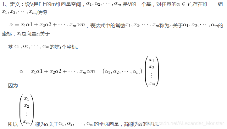 在线性代数中,坐标的全称为,***向量关于基的坐标。***其定义为: