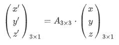 式中, ( x ′ y ′ z ′ ) T {\left( {x'{\rm{ }}y'{\rm{ }}z'} \right)^T} (x′y′z′)T是某一点在变换后的坐标系下坐标, ( x y z ) T {\left( {x{\rm{ }}y{\rm{ }}z} \right)^T} (xyz)T是该点在变换前的坐标系下的坐标, A A A是过渡矩阵(即变换矩阵)。 ( x ′ y ′ z ′ ) T {\left( {x'{\rm{ }}y'{\rm{ }}z'} \right)^T} (x′y′z′)T是3x1的矩阵, ( x y z ) T {\left( {x{\rm{ }}y{\rm{ }}z} \right)^T} (xyz)T是3x1的矩阵, A A A是3x3的矩阵,想要等式成立,必然左乘。