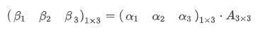 式中,(β1 β2 β3)是变换后的基(即变换后的坐标系),(α1 α2 α3)是变换前的基(变换前的坐标系),A是过渡矩阵(即变换矩阵)。(β1 β2 β3)是1x3的矩阵,(α1 α2 α3)是1x3的矩阵,A是3x3的矩阵,想要等式成立,必然右乘。